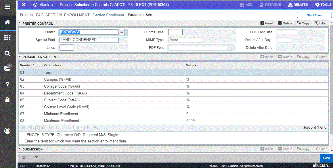 You may access the Section Enrollment Report using Direct Access or the Reports menu. When you select the Student Schedule report, the Process Submissions Control form (GJAPCTL) will display so that you may enter the parameters required to run the report.