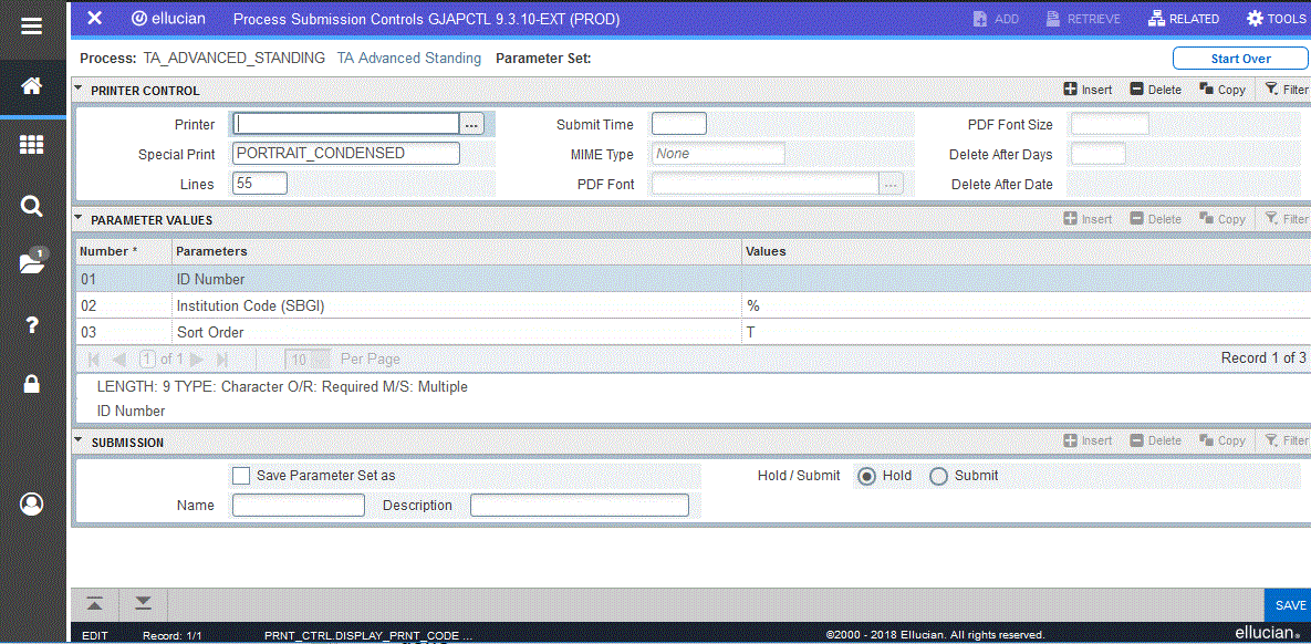 To run the job, you first need to set up the required parameters. The Process Submissions Control page (GJAPCTL) is used to enter parameters for jobs.